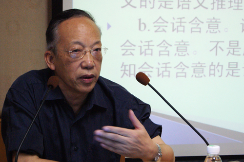 何自然随即把重点放在了语法、语用的互补和语法化这两方面,指出静态的语法现象有别于动态的语用现象,但语用现象有时会固化而成为语法现象,从而形成了我们所说的语法化。他又从平时大家常见的句子出发,详细地解释了语法和语义正确的不同句子,从语用学的角度看有着怎样的不同。同时,他从语用学的角度给大家介绍了一些词语、句子的新用法。