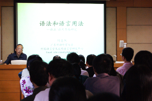 何自然首先向大家介绍了语法和语用的区别。他强调,要在重视语言使用的同时学好语言结构规则、学好语法,这样才能避免在口语笔语中频繁出错——“外国文盲的口语也很好,但那是不够的。”接下来,何向大家介绍了两本研究语法和语用的书,分别是Grammar, Meaning and Pragmatics 和Pragmatics and Grammar。他巧妙引用了其中一个比喻:语法和语用是一对“同床而异梦的恩爱夫妻”,虽然在出现矛盾时需要分开,但却不能绝对独立。借此,他表达出自己的观点:语法不一定要理解为大脑里固有的,语法更多是来自语用,同一说法被广泛使用就成了语法。