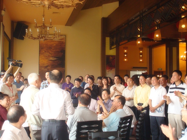教师代表李启源、肖沛雄及邵学言分别发言。他们或回首往昔、忆苦思甜,或寄语学生再创辉煌,或抒“怀念不如相见”之情。老师们真情流露,校友们感慨不已。在盛兵的倡议下,全场校友围向原外贸学院院长钱益明,齐声鼓掌并恭祝钱院长健康长寿。