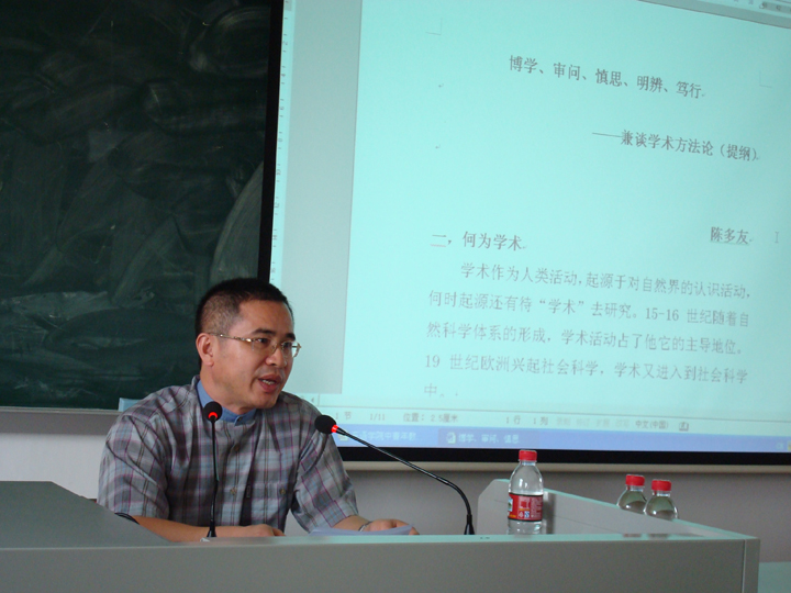 接着,陈多友引经据典,循序渐进,剖析母校“十字训”,畅谈学术科研方法论。他说,博学不是一味对知识占有,应发挥其主观能动性,赋予知识学习以主体性,建树自身的思想理论体系。而在学术研究过程中,善于独立思考,“大胆设想,小心求证”,以科学的态度严谨治学,落实于“行”,吃苦耐劳,谦虚谨慎,发挥真感情,真性情。最后,他总结道,学术科学研究是创新的基础,在市场经济的现状下,要认清什么是科研,什么是研究,坚持广博学识,独立思考,批判错误思潮。