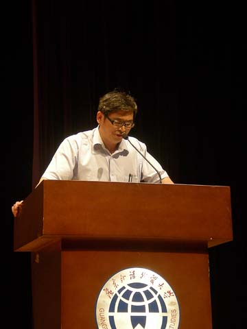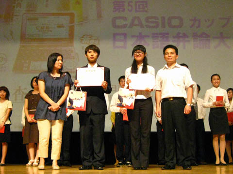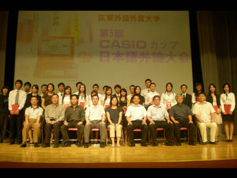 本网讯 10月25日下午,广东外语外贸大学第五届“卡西欧杯”大学生日语演讲比赛决赛在云山会堂隆重举行。卡西欧(上海)贸易有限公司电子辞典营业部华南课课长中村理惠、学院党委书记林绍雄等嘉宾及副院长陈多友、日语系主任丁国旗、研究生办公室主任刘金举以及日语外教浅井治、桥本司等评委出席了决赛。23名从预赛中脱颖而出的选手在决赛中各有千秋,多层次、多角度地诠释主题,给观众带来了别样的“日语风情”。
