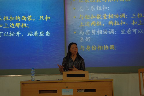 讲座一开始,谢秀兰便以一身干练、合体的深色职业装和优雅的职业素养吸引了同学们的注意。开篇,她就以风趣、生动的语言讲解了求职礼仪的涵义、重要性以及中西方礼仪的起源,并指出内外的和谐统一是专业形象塑造的艺术和技巧所在。