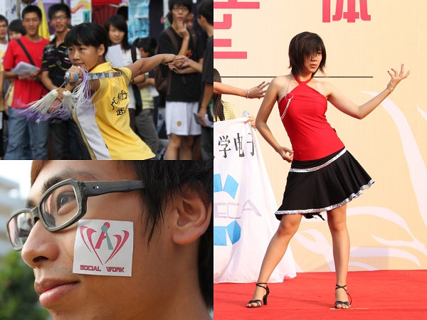 在5栋宿舍楼前方的舞台展示区也是招新活动不容错过的亮点。52个学生团体分成3个时段一一登台亮相,向新生介绍协会的性质、精品活动以及文化特点。他们挥动会旗、展示活动照片或实物,直观地再现协会特色。此外,还有一部分学生团体进行了精彩的才艺展示。书画协会指导老师现场挥毫“以书会友、以画传情”;TGC劲爆火辣的热舞表演出poker face;无限动漫协会新潮的日本动漫舞蹈“笨蛋9算术班”让人眼前一亮;绿精灵体育舞蹈协会的恰恰和伦巴将现场观众带到了舞蹈王国……风采展示尽显团体本色。