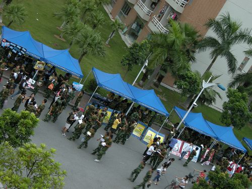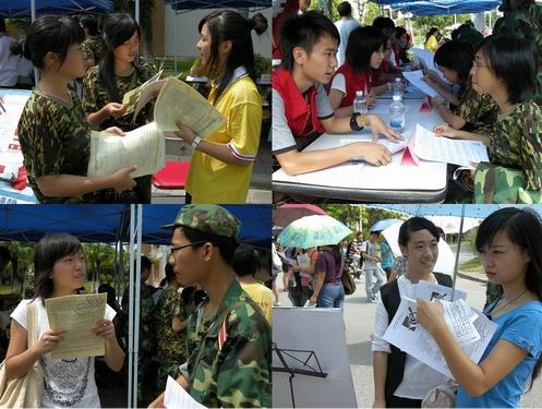 本网讯 绿色的军装,疑惑的表情,认真的提问……9月22日中午,在校道上,校级四大组织——校团委、校学生会、校团联和校艺术团体联合招新咨询会正如火如荼地进行着,“四团”的摊位前都聚集着前来咨询的09届新生。