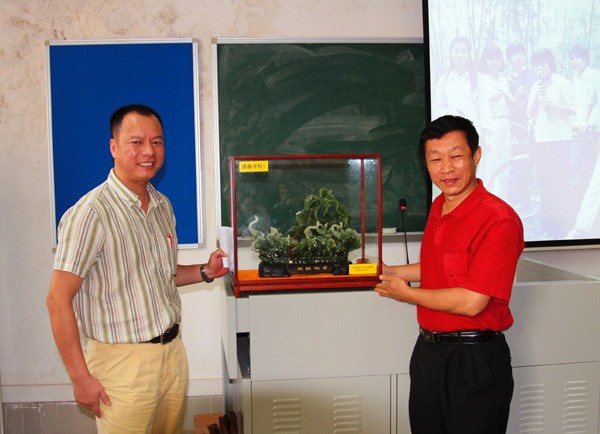 周云汉代表85级日语的全体同学向母校赠送一座玉石工艺品,命名为“欣欣向荣”,带给母校美好的祝愿。许国彬代表学校感谢校友们的一片心意。