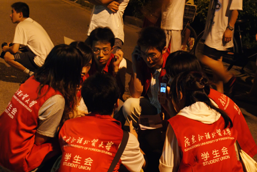 现场人声鼎沸,引来了众多路人观看。晚上十点左右,内环路上就挤满了观看亮灯仪式的人,虽然天气很酷热,但是同学们的热情丝毫没有减退,一直在耐心等待,翘首以盼。现场校学生会的工作人员一直在紧张忙碌地布置工作,一切准备就绪。