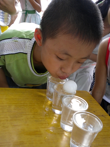 “我们最喜欢玩‘四人接力吹乒乓’!”二年级B班的一个同学笑着说。这个游戏要求参赛者将乒乓球从第一个杯子吹向最后一个杯子,平稳过渡才算过关。“力度要小一点。”队友们友好地相互提醒。“我们完成了!”当他们成功地把乒乓球吹到最后一个杯子时,欢呼着相互击掌。