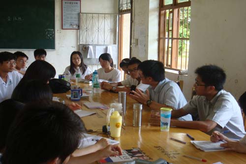 “爱依然”副队长姜楠说明了几天来遇到的队员形象、宿舍情况等问题,并对学校的积极配合表示感谢,义教组组长介绍了4天来教学气氛、教学科目、老师反馈等教学情况及晚自习辅导情况,以及宣传组开展的已获得较大成效的每日英语角,该活动增强了学生自信心,使一些较害羞的同学已能够开口大声讲话。调研组组长说明了调研遇到的语言、联系等问题及解决方案,并介绍了调研采用的几种方法及进展安排。