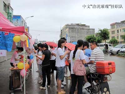 大约一个小时后,雨水开始变小,乌云散去,队员们迅速地重新摆出摊位,正式开始“关注健康,清凉一夏”的服务活动。虽然因为雨天市场的行人减少了,可是队员们没有感到沮丧,反而积极地走向路人,走进市场,热心地为群众宣传夏天卫生小常识和甲型H1N1流感知识,为他们送上一杯徐其修凉茶。很快,人流开始多起来,也有不少人主动前来喝凉茶和了解一些卫生知识,队员们都用十足的热情用心服务,细心端上精心泡做的凉茶,耐心讲解健康卫生常识。