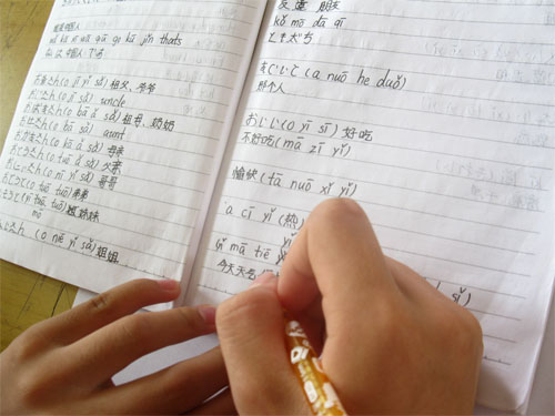 首先,张霭君从发音有联系的表示亲属关系的词语开始教,例如“爷爷”、“叔叔”、“奶奶”“婶婶”。她将每个词都写在了黑板上,并用日语拼音注释音,方便学生念。老师念一句,学生就大声跟读。刚听老师读完“爷爷”和“叔叔”两个音的时候,有些学生不能分辨区别,老师耐心讲解“爷爷”中间还有一个“i”的音之后同学们都能很好的读出区别了。之后学生们又学了一些“你好”“早上好”这些日常用语和常用的形容词。学生们很认真地做笔记,并用拼音做了发音的注释。