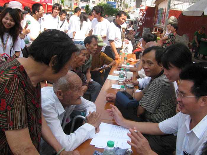 在普法队进行咨询会工作的同时,义诊队也在咨询台旁摆放了一个义诊台,吸引了大量的以老人为主的人群前去围观及坐下接受义诊。