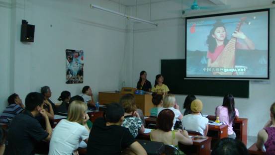 还没开始上课,同学们就被荧幕上正播放着的2008北京奥运开幕式上的《春江花月夜》所吸引,都目不转睛地看着。课上,同学们欣赏了中国古典名曲《十面埋伏》。极富中国特色的琵琶,华丽的轮指,紧张的音乐情境都让同学们深深地体会到中国的特色魅力。