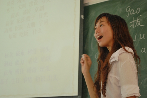 普通话发音及诗朗诵的课上,老师韩蕊耐心地教学生发音,还一一记录下同学们的典型错音。学生们张着嘴一遍遍地跟着老师读:“太阳”、“豆腐”……“轻声和字母l、n的区分是他们的弱项”,韩蕊如是说。
