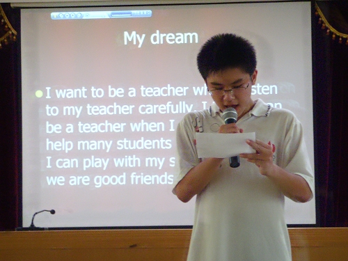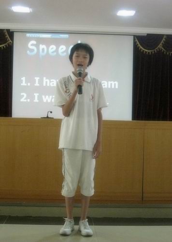 首先进行的是演讲环节,题目为“I have a dream”。选手们镇定自若的临场表现博得阵阵喝彩,他们纯真的梦想也深深打动了评委:有的想当一名老师,传播知识;有的想当医生,悬壶济世;有的突发奇想,想成为一只小鸟,翱翔蓝天……2号选手嘉绮刚上场时非常紧张,没有发挥出正常水平。最后在评委及观众的掌声鼓励下,她才放开自己,渐入佳境。面对评委的刁钻问题“如何当好公务员”,嘉绮用英文流利地表达了自己从现在做起、努力学习的决心。
