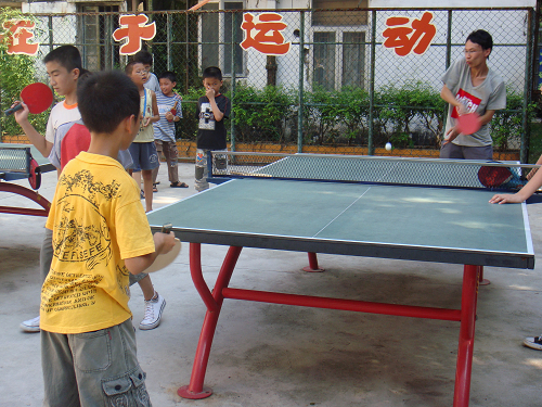 乒乓球的热度与舞蹈课不相上下,这是博爱小学的一大特色,操场上摆放着四台高质量乒乓球桌。球桌后是几个鲜红的大字——“生命在于运动”,这正是博爱小学的体育精神。据悉,这里的学生大都热衷乒乓球,且具备一定水平。课上,老师与学生互磋球技,打起了友谊赛。老师一上场就给了学生一个下马威。只见他侧身、半蹲、抛球,“啪”的一声,一个漂亮的高抛球引起一阵喝彩,让学生佩服不已,纷纷虚心向老师求教。