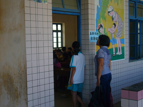 队员发现,教室门口有位母亲不断向内张望。之后了解到,这位母亲7点多就带着两个孩子来到了学校,直到上课也仍然没有离开,就静静地站在教室门口望着。她解释道,“我今天想到学校看看孩子的学习情况如何”,并表示十分支持此次三下乡工作。