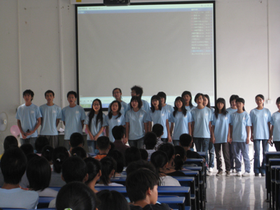 “爱心中”服务队队长陈立首先向三坑中学的校领导对此次三下乡活动的支持表示感谢,并表示将努力做好每一个细节。他给在场人员播放了一段简短的队员介绍视频,以拉近队员与学生的距离。随后,义教组成员一一进行自我介绍与课程介绍。开学典礼在“爱心中”全体队员的队歌大合唱中圆满落幕。
