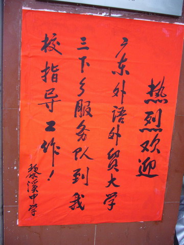 在黎溪中学的校门口显眼地贴上了“欢迎广东外语外贸大学中文学院三下乡服务队到我校指导工作”的标语,负责接待的李老师对队伍成员表达了热烈欢迎,并带领同学们顺利入住,安排好各项工作。