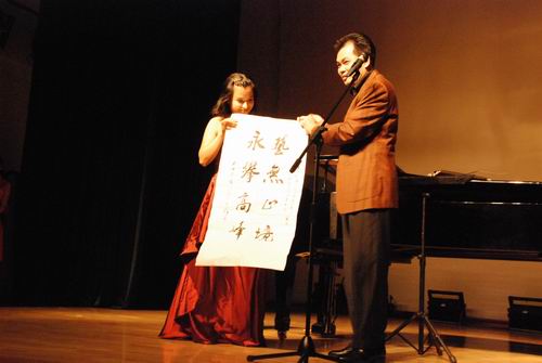 晚会由一曲轻快的《青春舞曲》拉开了序幕。随后艺术学院前任院长温恒泰教授代表艺术学院全体老师向09届毕业生致辞,他深情地回顾了05级学生从招生到入学再到毕业留给他的印象,像一位父亲在对孩子深情地诉说,饱含着对学生深切的爱和衷心的祝福。他还向艺术学院第一位录取的学生陈玉莲赠送了一副“艺无止境,勇攀高峰”的字画,向09届全体毕业生赠送了他的个人专辑——恒泰之声。