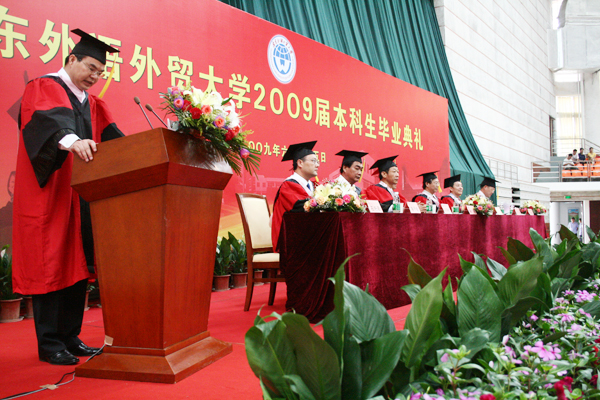 本网讯 又是一年仲夏至,又是一年离别时。6月25日上午,2009届本科生毕业典礼在南校区体育馆举行。来自经贸、管理、信息、政管、教育、新闻、艺术学院的毕业生齐聚一堂。校长隋广军,党委副书记陈建平、许国彬,副校长方凡泉、陈子锐、仲伟合、石佑启,以及各学院领导、师生、毕业生家长等也出席了典礼。典礼由学生处处长植秀聪主持。
