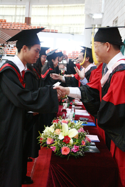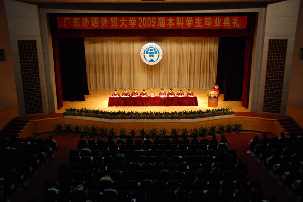 又讯 6月25日下午,来自英文、商英、西语、东语、中文、法学、翻译学院的2009届毕业生齐聚北校区云山会堂,参加2009届本科生毕业典礼。