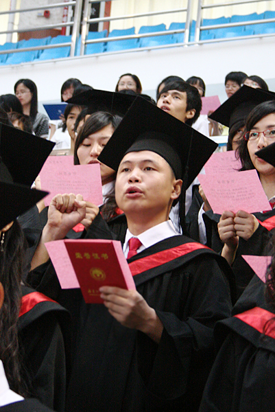 最后,全体毕业生庄严宣读毕业誓词,校歌《凤鸣岭南》再次响起,为2009届本科生毕业典礼画上圆满句号。