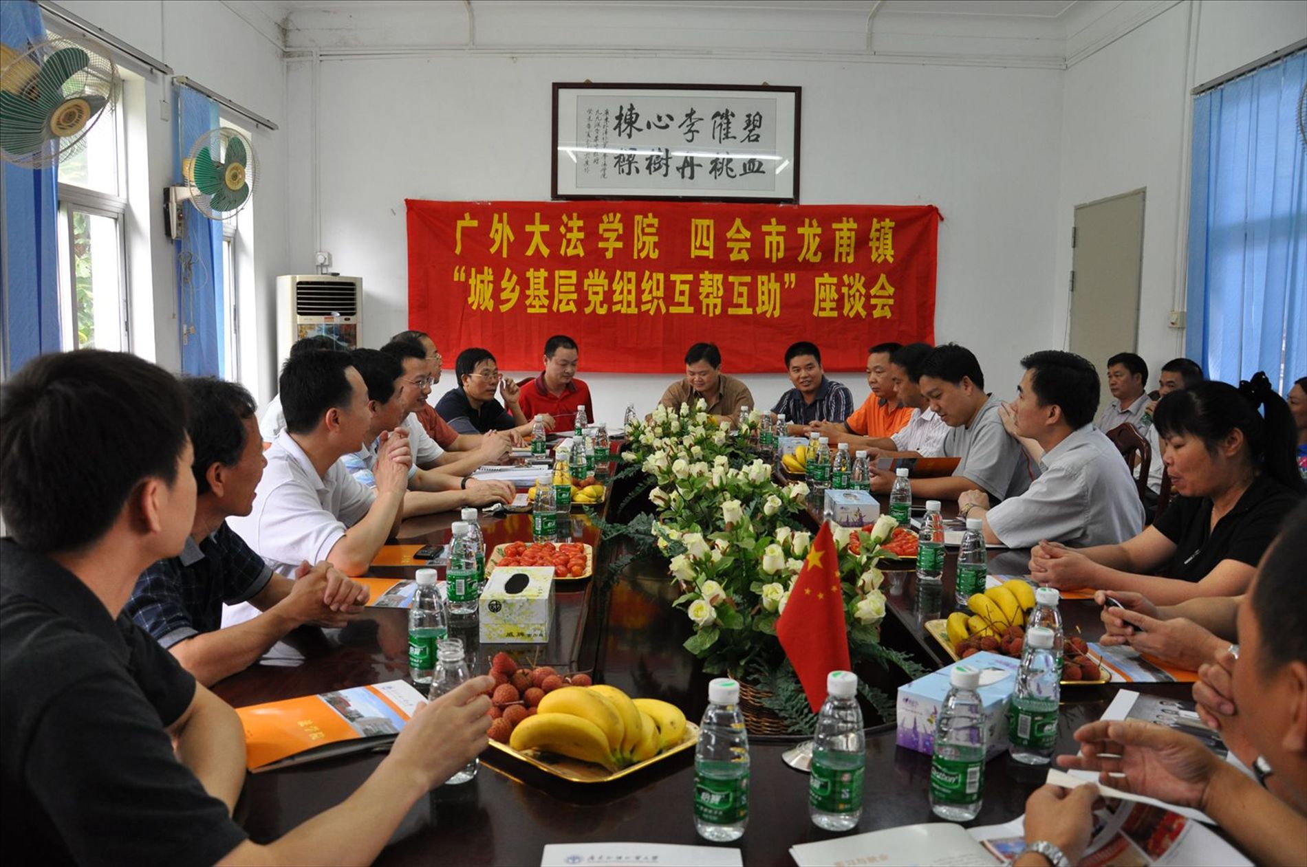座谈会由法学院党委书记金良成主持,法学院院长蔡镇顺教授介绍了学校、学院的概况,吴掁军介绍龙甫镇的基本发展状况。随后双方就组织共建、资源共享、党员互帮、城乡互助等四个方面的内容进行深入探讨,碰撞出不少思维的火花。四会龙甫镇的同志们谈到在经济快速发展的过程中,体味到依法行政的重要性,同时也认识到干部和村民的法律意识普遍有待进一步提高。双方在交谈中逐步就法学院在征地、土地承包、房屋产权登记、经济合同纠纷等诸多法律问题为四会龙甫镇提供法律保障与支持,四会龙甫镇为法学院提供调研资料等方面提供帮助达成共识,共同促进城乡和谐发展。双方还就暑假法学院大学生赴龙甫中学进行送法下乡、义教为主题的“大学生三下乡”活动、帮扶村支部困难党员、资助困难学生、为镇文化站提供法律图书和电脑设备等细节问题进行了讨论。