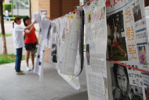 近来路过F栋上课的学生应该会注意到,往常空荡荡的F栋一楼架空层出现了一张张精致的报纸,它们由三根红色尼龙绳串起悬挂在F栋一楼的柱子上。据了解,本次活动是由新闻学院首次举办的08级新新闻人报展,展出的作品是由国际新闻专业08级学生经过一个学期精心制作而成的报刊。