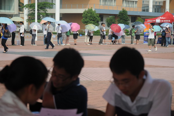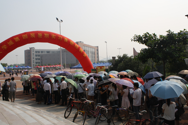 招聘会当天最高气温高达34摄氏度,尽管天气炎热,学生的求职热情却丝毫不减。除了大学城内各高校学子,部分大学城外高校学生也慕名而来。几名来自仲恺农业工程学院的同学一早就乘地铁赶到招聘会现场,我校南国商学院的学生也不顾炎炎烈日,坐了一个多小时车前来应聘。离招聘会开始还有十五分钟时,场外打着一把把五颜六色太阳伞等候入场的学生们早已排成一条长龙,成为一道独特的风景。