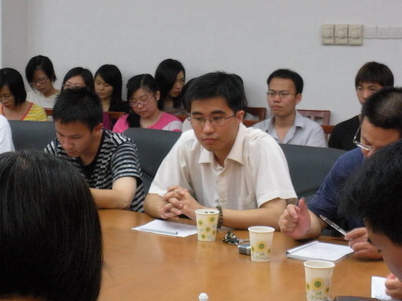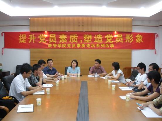 本网讯 5月26日7:00,“提升党员素质,塑造党员形象”政管学院党员素质论坛系列活动之“理想与责任”——党员意识座谈会在院系楼四楼政管学院会议室顺利举行。学院党委书记范静静、学院党委副书记麦培年、党员教师代表郑亚伟,优秀毕业班党员代表林青、陈颖、杨金杯、叶祥杰、周曦、马婷出席了今晚的交流会。