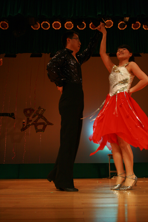 随后,赖志玲为大家带来惊喜,一炫舞技。在 “赖老师我爱你”的呼喊声中,辅导员赖志玲、苗磊和学生吴夏莉等一起迈着优雅的华尔兹舞步旋进舞台。正当同学们屏住呼吸,沉浸在那优美的意境中时,舒缓的音乐突然跳跃起来。台上的舞者迅速调整舞步,以一段活力动感的恰恰再掀热浪。最终,赖志玲用一段令人目眩神迷牛仔舞为精彩绝伦的表演《炫舞青春》画上了漂亮的句号。