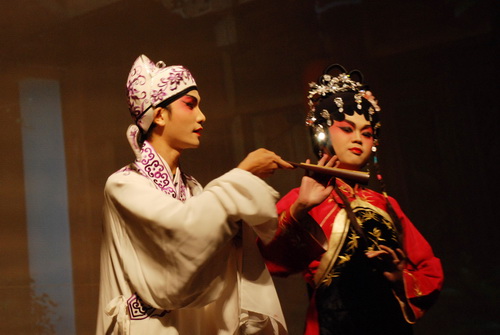 倒数的数字在大屏幕上显现,接下来的视频里,两位主人公正描眉装扮,穿上戏服准备登场。视频突然中断,两位主角来到舞台正中,一曲《游龙戏凤》拉开了晚会的帷幕。