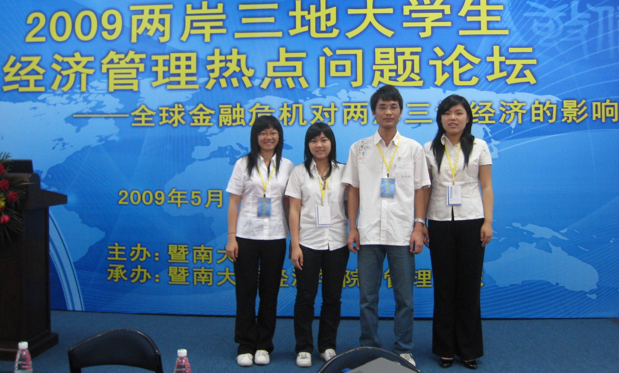 本网讯 为增进两岸三地大学生的交往与沟通,促进两岸三地大学生的友谊和学术交流,我校经贸学院学生代表刘胜、蓝美静、严洁、庄洲娟一行4人应暨南大学的邀请,于5月10日至16日赴暨南大学参加2009两岸三地大学生经济管理热点问题论坛。