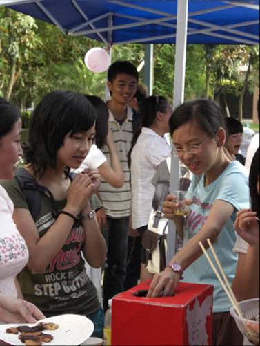 虽然每个摊位的布置各不相同,但奉献爱心的精神却是一样的。在每个摊位上均设有募捐箱,方便大家奉献爱心。在尽享饕餮美食之时,同学们没有忘记给予地震灾区孤儿同情和关怀。同学们纷纷在各个摊位上的留言板上留言,为灾区孤儿祈愿祝福。另外,这次募捐活动共为灾区孤儿筹得善款3200.4元人民币。同学们用自己的实际行动,践行“心系灾区,奉献爱心”的可贵精神。