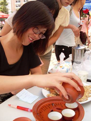 在现场的另一边,摊位“潮”,以潮汕文化为切入点,给同学们带来了潮汕特色饼,沙茶粿等特色小吃。同时,该摊位还教授潮汕功夫茶的泡茶技巧,吸引了许多对此感兴趣的同学。
