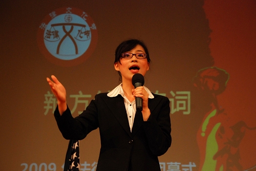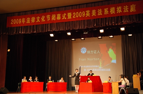 在简要地回顾完法律文化节的各种活动后,便进入了本次活动的重头戏——2009英美法系模拟法庭的庭审阶段,并创造性地随机抽取了12名现场观众组成陪审团。随着法官、书记员及辩控双方先后入座,书记员宣读法庭规则,陪审团成员宣誓完毕,庭审正式开始。