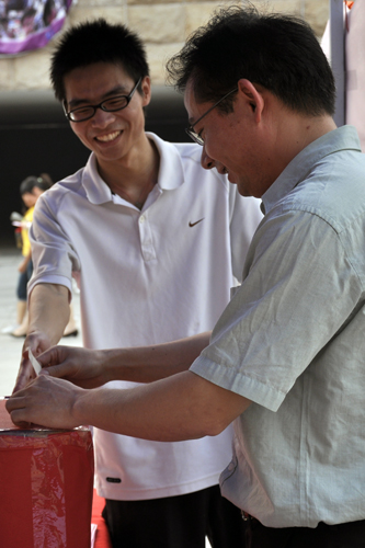 当天下午,校党委副书记许国彬也来到了活动现场。他先是带头捐出了善款,随后他又对前来募捐的老师和学生们表示感谢,并与他们一起合影留念。许国彬表示,一年前地震发生时,学校就表现出了极大的关注与热情并捐款200多万。一年后的今天,学校也能以同样的热情去纪念,不仅思想感情支持,实际行动也做得很好。他还表示,学校对于来自灾区的学生一直都很关注,而且学校在爱心捐助方面积极主动,无论是学生还是学校员工遇到困难,都能得到积极的援助。他希望这种精神能够继续发扬,“把钱积累下来,对困难家庭很有帮助”。最后,许国彬还表达了他对四川的祝福:齐心协力,任何困难都可以克服;齐心协力,任何事情都可以做到。