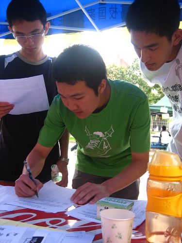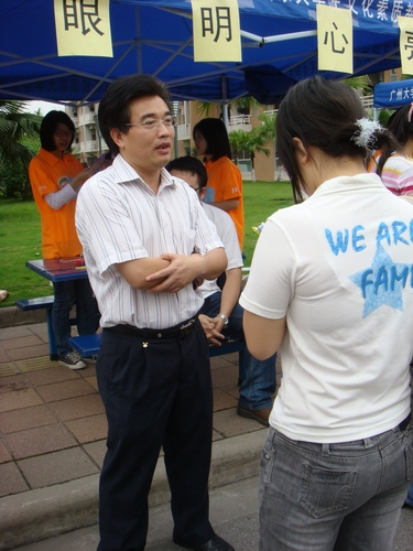 本网讯 4月23日下午,由商英学院南校区学生党支部举办的学生党建“和谐 • 发展”系列活动之大型党员活动日,在广外南校生活区校道上举行。商英学院党委书记谢应东、07级辅导员黄汐、徐艺青以及08级辅导员陈思到达现场并参与活动。