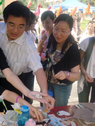 欣赏过8个小组的DIY展示作品之后,同学们来到互动区亲自体验动手参与的乐趣。16名参赛代表现场制作DIY作品,将制作方法教授给参与互动的老师和学生们。A组的玫瑰花制作简便易行,作品精美可爱,吸引了众多师生。H组的“Dreamhouse”让参与者尽情享受了DIY的乐趣。参赛者细心详尽地教授制作方法,观众们热情高涨地参与制作。精致的小花蓝、盛开的百合花、色彩斑斓的灯罩……现场成为DIY的海洋,充满了欢声笑语。