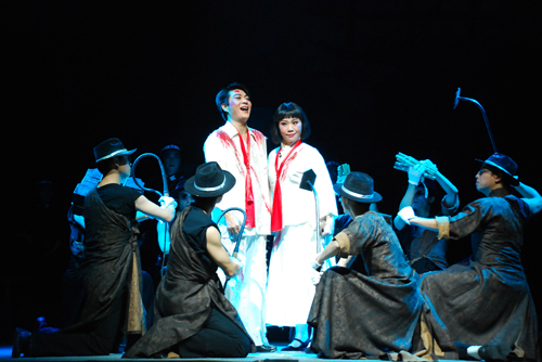 包括序幕共九场的粤剧持续时间超过了两小时,偌大的会场却无人离席,掌声不断响起。台词中“初吻”“NO.1”“揸拿”等词语赢得在座学生的阵阵欢呼与叫好。一群穿着黑衣、戴着黑帽和墨镜的特务伴着动感十足的音乐和灯光舞蹈,用透明幕布和灯光营造出的带有梦幻效果的背景也“谋杀”了现场摄影师们不少的胶片。
