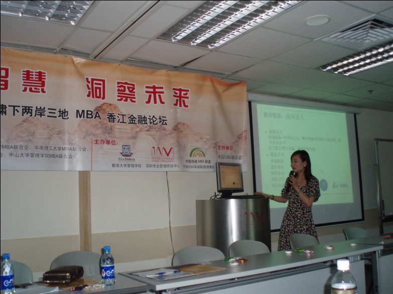 本网讯 4月17日上午,由中国MBA华南联盟理事会组织的学术交流暨香港金融论坛在香港隆重,来自中山大学、华南理工大学、暨南大学、广东工业大学、广东外语外贸大学、湖南大学、云南大学、重庆大学、香港浸会大学、台湾亚洲大学的90多名MBA学生参加了论坛,本次盛会由暨南大学管理学院、香港国际专业管理研究中心(IAM)和中国MBA华南联盟理事会承办。