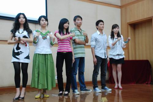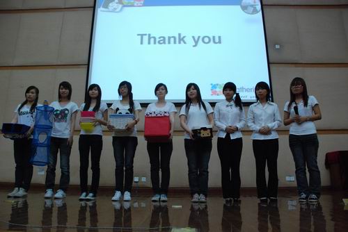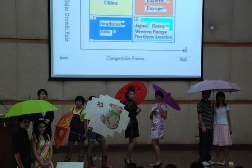 伞光点股份有限公司的队员们一上场就吸引住了同学们的眼光,有身穿旗袍、手擎油纸伞的“丁香姑娘”、穿着时尚的白领女士、更有同撑一把伞的热恋情侣,他们的产品形式多样化,不同的服装造型搭配着不同的雨具,有创意又不失内涵。不仅如此,主要讲解人员大方的仪态、流畅的英文口语,配上舒美的背景音乐和精美的PPT,更为他们的展示增色不少。最后这支队伍以90.25分得到此次舞台展示环节的的最高分。