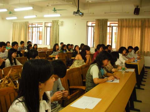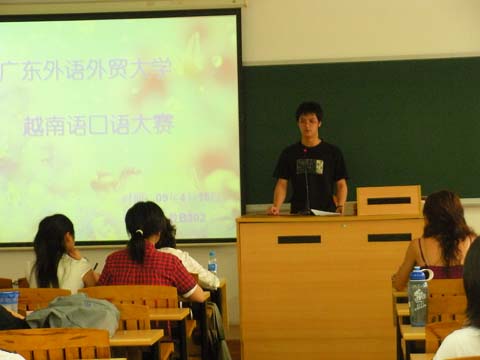 本网讯 4月15日下午,“广东外语外贸大学越南语口语大赛”在北校区六教B302举行。担任大赛评委的有东语学院越南语系主任石宝洁、教授林明华、副教授黄以亭等。越南语系06级周洋、王蕾主持了本次比赛。