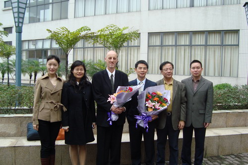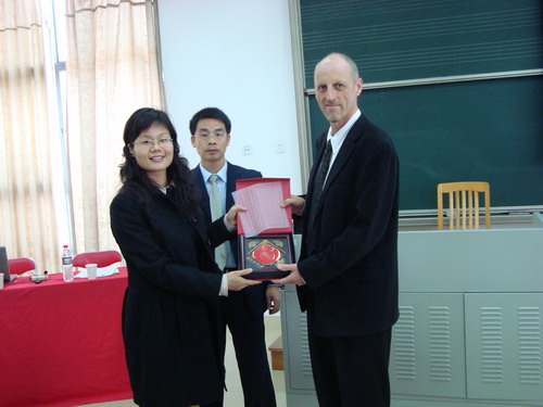 讲座开始前,举行了简单而热烈的欢迎仪式,车小真代表学院向两位教授赠送纪念品。