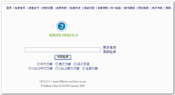 图书馆在“2009年图书馆活动月”到来之际推出的新版书目检索系统GDUFS OPAC2.0,强化了图书馆对读者知识获取的服务,注重读者的参与、分享和个性化体验。图书馆欢迎广大读者登录http://opac.gdufs.edu.cn:8991/F,在获得全新感受的同时,为优化图书馆服务提出您宝贵的意见和建议(Email:webopac@gmail.com)!