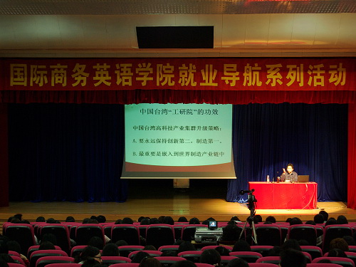本网讯 3月30日晚,中山大学博士任荣伟做客我校,在北校的六教报告厅为商英学院06级的同学们带来一场名为“金融危机下的创业与创新”——国际经验对当代大学生的启示的讲座。该讲座是商英学院职业导航系列讲座的第四场。商英学院党委副书记骆银花、商英学院教授张武保、广外音像出版社总经理陈积旺、05级辅导员谭秋云、06级辅导员连勇莅临讲座现场。