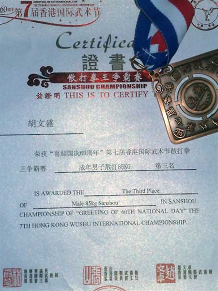 宋正刚、关文坚、胡文盛分别角逐男子太极拳、男子翻子拳、男子短器械、男子剑术与成年男子85KG级散打争霸赛的五项比赛,赛场上,他们以一套完美连贯的套路、一个跳跃、一个翻身勇夺“一金三铜”。特别是教练员兼运动员宋正刚老师,面对来自世界各地的强大对手,镇定自如,柔缓的动作中夹带着猛烈,平和的表情中透露出神采飞扬,获得评委一致好评摘得男子太极拳金牌,同时他还获得男子翻子拳国际级铜牌。2007级商英国贸专3班关文坚同学获得男子扇术第3名,剑术第4名;2007级商英国贸专1班胡文盛同学更是打下了散打王争霸赛成年男子85KG级的铜牌!