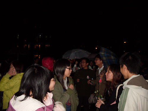 “网俱的女生快下来!”约二十多位“网俱人”聚集在女生宿舍楼下高呼口号。当网球俱乐部的女生陆续从宿舍下来,他们就把已准备好的玫瑰递到她们面前并祝她“节日快乐!”。这一举动吸引了女生宿舍大批同学的注意,为了一探究竟,很多女生纷纷聚集到各层的走廊。当“网俱”的男生们齐声大喊“女生节快乐”时,女生们则齐声回复:“谢谢!”