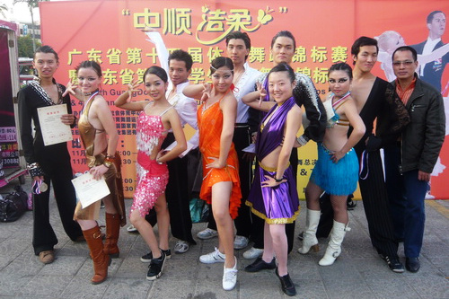 (右一组合获高校组伦巴、恰恰第三名;左一组合获高校组伦巴第二名;左二组合获高校组伦巴第五名)