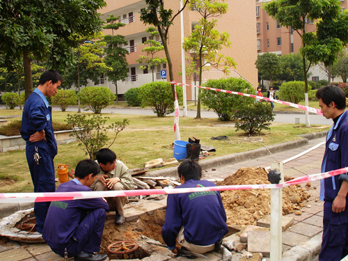 中午时分,在3栋对面已有大众物业机电部的工作人员在抢修水管了。其中一位师傅说,这次停水是在12日凌晨4、5点时,供应1、2、3栋食水的主水管发生爆裂所致。早晨6点时已经停水。“水管内部的垫因为天气原因,受冷收缩而松开,致使水管所受压力太大而破裂,但属于正常现象。”师傅说道,“如果抢修工程进度顺利,预计今晚6点左右就能恢复供水。”